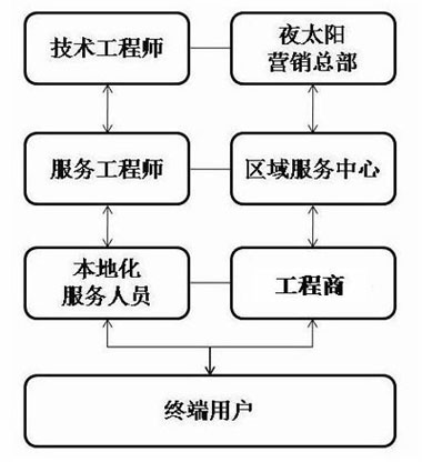 意識到時間問題的嚴(yán)重性,夜太陽制定了服務(wù)本地化三原則:維修人員本地化、備用配件本地化和備換整機本地化。維修人員本地化就是對工程商的技術(shù)人員進行相關(guān)技術(shù)培訓(xùn),使他具備處理應(yīng)急問題的能力,最大限度降低因產(chǎn)品問題帶給終端用戶的損失;備用配件本地化、備換整機本地化就是在技術(shù)服務(wù)中心存放一定量的配件和整機,方便嚴(yán)重問題產(chǎn)品的及時更換。圍繞這三條原則,夜太陽構(gòu)建起了三級服務(wù)體系。