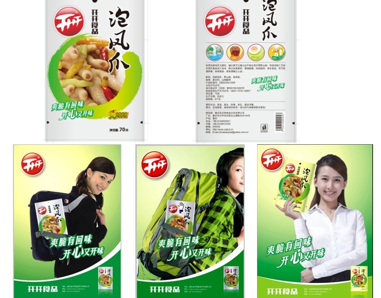 產(chǎn)品的核心利益點指的是產(chǎn)品能給消費者的利益和消費者對該產(chǎn)品需求之間的最佳連接點。每個品類的產(chǎn)品需要提煉出一個核心的賣點以及系列的支持點,而這個核心的利益點便是該產(chǎn)品傳播口號的基點。提煉產(chǎn)品的核心利益點的過程就是要把產(chǎn)品自身的特點、優(yōu)勢與消費者對休閑食品的需求有機結(jié)合,提煉出該產(chǎn)品對時尚、口味、營養(yǎng)、健康等基本需求的理解,并以形象的方式表現(xiàn)出來。項目組針對開開的品牌內(nèi)涵和寶亦德公司獨特的產(chǎn)品工藝提煉出四大產(chǎn)品賣點:山泉浸泡、自然味道;瓦罐秘制、口口醇香;無輻照、更健康;獨特配方、絲絲入味。并開創(chuàng)泡鳳爪行業(yè)先河,將每個賣點創(chuàng)意成卡通圖案,更加形象生動表現(xiàn)出來,深入消費者的心智。抓住泡鳳爪爽、脆特點以及與品牌的聯(lián)系,創(chuàng)意出開開泡鳳爪的產(chǎn)品傳播語“爽脆有回味開心又開味”。