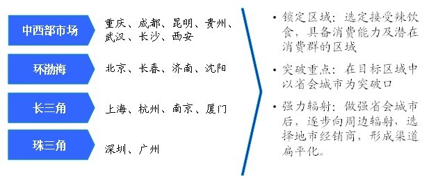 綜合考慮市場的飲食習慣、休閑生活、消費能力、流動人口情況,項目組認為寶亦德的市場布局策略應該是:鎖定區(qū)域,突破重點,強力輻射。