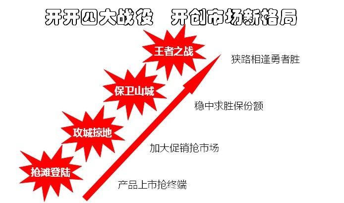 戰(zhàn)略與戰(zhàn)術(shù):乃二個全異之行動。戰(zhàn)術(shù)是關(guān)于戰(zhàn)斗諸種行動之指導法,戰(zhàn)略乃連系配合各種戰(zhàn)斗之謂。戰(zhàn)略為作戰(zhàn)之根源,即創(chuàng)意定計;戰(zhàn)術(shù)乃實行戰(zhàn)略所要求之手段。開開推廣戰(zhàn)略已經(jīng)明確,但如何進行戰(zhàn)略執(zhí)行和落地?項目組策劃開開品牌四大戰(zhàn)役,開創(chuàng)市場新格局。