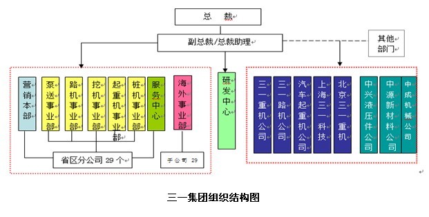 三一在全球設(shè)有多個(gè)研發(fā)、制造、服務(wù)和營(yíng)銷(xiāo)機(jī)構(gòu),國(guó)內(nèi)各省區(qū)都設(shè)立有分公司,分公司獨(dú)立注冊(cè),作為總部營(yíng)銷(xiāo)決策的執(zhí)行機(jī)構(gòu),同時(shí)也是區(qū)域業(yè)務(wù)開(kāi)展的決策和執(zhí)行機(jī)構(gòu),分公司承擔(dān)經(jīng)營(yíng)業(yè)績(jī)指標(biāo),接受總部對(duì)人、財(cái)、物資源及業(yè)務(wù)活動(dòng)過(guò)程的監(jiān)督。另外,三一在國(guó)內(nèi)設(shè)有許多個(gè)6S店,這些6S店得職能包括銷(xiāo)售、零配件、售后服務(wù)、信息反饋、產(chǎn)品展示和專業(yè)培訓(xùn),三一的6S店風(fēng)暴讓行業(yè)內(nèi)外震撼。