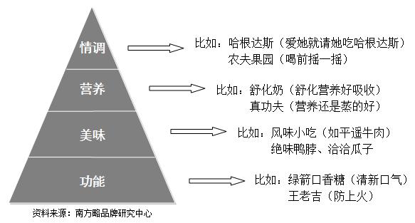 如上圖所示,這可以說是馬斯洛需求層次理論在食品行業(yè)中的實(shí)踐版。從消費(fèi)者需求層次層面來劃分的話,食品的價(jià)值屬性由低到高可歸結(jié)為四類:功能、美味、營(yíng)養(yǎng)和情調(diào)。