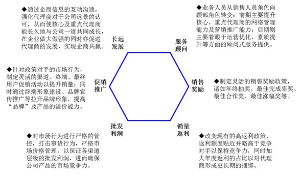 通過廠商互補以開發(fā)維護市場:以核心、重點經(jīng)銷商為主要對象,市場開發(fā)與維護逐步實現(xiàn)由經(jīng)銷商單干的放羊式銷售向經(jīng)銷商為主、公司人員協(xié)助的協(xié)銷模式發(fā)展,最終發(fā)展為廠商共同開發(fā)維護市場的聯(lián)合式分銷模式。