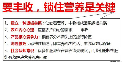 通過控失肥的成功上市,在“新的概念”上來?yè)寠Z競(jìng)爭(zhēng)對(duì)手(其它控失肥廠家和穩(wěn)定肥品牌)的“產(chǎn)品概念”和眼球與關(guān)注度,在概念上來消減它們的勢(shì)能,并形成戰(zhàn)斗氛圍,營(yíng)造市場(chǎng)熱點(diǎn),實(shí)現(xiàn)控釋肥乃至企業(yè)品牌競(jìng)爭(zhēng)力的突破;
