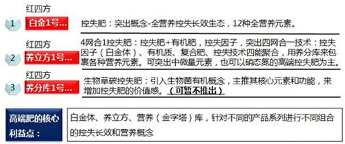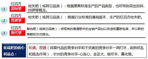 以控失肥的產(chǎn)品概念和農(nóng)戶需求以及渠道策略為主線來規(guī)劃紅四方旗下的各控釋肥產(chǎn)品線;通過豐富的高中低端三個(gè)層次的產(chǎn)品線滿足市場(chǎng)需求,并炒熱市場(chǎng)。
