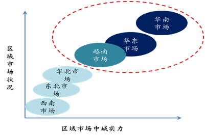 南方略顧問團(tuán)隊在對各主要區(qū)域市場進(jìn)行調(diào)研分析后,按照區(qū)域市場發(fā)展?fàn)顩r和中城在區(qū)域市場的實力兩個主要因素,對區(qū)域市場進(jìn)行劃分,劃分為根據(jù)地市場、重點市場、發(fā)展市場三個等級。
