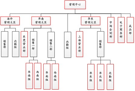 在營銷中心下面,按照區(qū)域進(jìn)行業(yè)務(wù)部門的設(shè)立,成立華南營銷大區(qū)、華東營銷大區(qū)、海外營銷大區(qū),并在各營銷大區(qū)下設(shè)銷售部,銷售部再按照客戶類型和更小范圍的區(qū)域進(jìn)行劃分。各業(yè)務(wù)部門在自己所屬的區(qū)域內(nèi)進(jìn)行客戶的開發(fā)和維護(hù),將客戶開發(fā)和維護(hù)下沉至更小的區(qū)域市場。隨著區(qū)域市場的發(fā)展,營銷大區(qū)下設(shè)的銷售部能夠?qū)崿F(xiàn)分離,實現(xiàn)營銷大區(qū)的快速復(fù)制。
