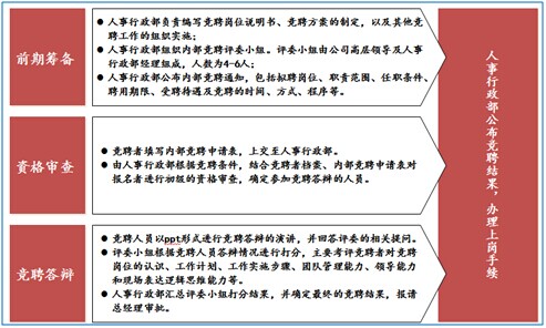 內(nèi)部競聘主要分為四大步驟,包括前期的籌備、資格審查、競聘答辯及最終上崗。人事行政部負(fù)責(zé)前期的籌備,主要包括制定競聘方案、發(fā)布公告、組建評審小組等;資格審查主要是人事行政部按照競聘崗位的要求對員工競聘申請表進(jìn)行審查、篩選;競聘答辯包括競聘人進(jìn)行競聘陳述、評委小組進(jìn)行提問等環(huán)節(jié);最終,競聘通過的人員由人事行政部安排上崗。