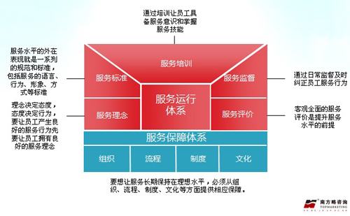 服務(wù)體系包含兩大部分:一是直接與服務(wù)過程相關(guān)的服務(wù)運(yùn)行體系,二是為服務(wù)運(yùn)行提供保障的服務(wù)保障體系。目前后勤服務(wù)行業(yè)還處于粗放管理階段,海泰要打造新的品牌形象就必須對服務(wù)理念和服務(wù)標(biāo)準(zhǔn)進(jìn)行升級,把服務(wù)培訓(xùn)納入日常經(jīng)營活動(dòng)中,使陽光海泰的服務(wù)活動(dòng)形成具有理念、標(biāo)準(zhǔn)、培訓(xùn)、監(jiān)督和評價(jià)在內(nèi)的一個(gè)完整體系,并從組織、流程、制度、文化的角度為服務(wù)運(yùn)行提供相關(guān)保障。