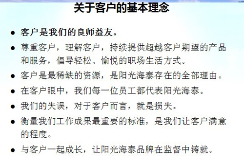 陽光海泰的基本服務(wù)理念包含客戶、員工和服務(wù)三個(gè)部分: