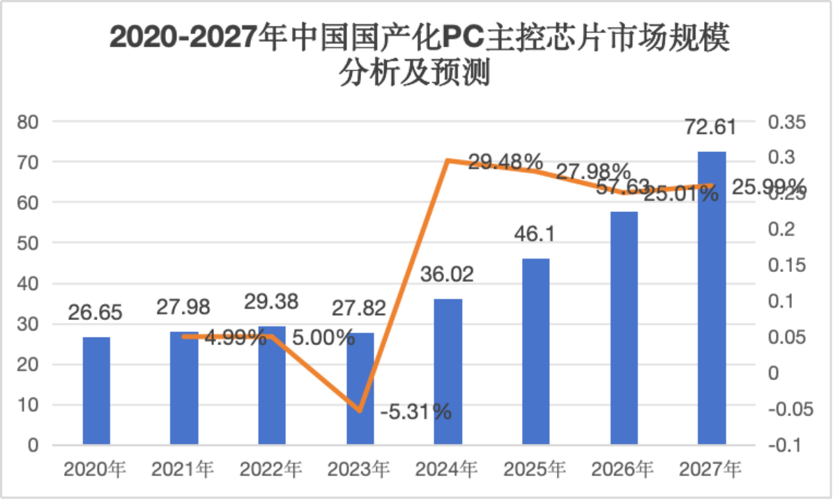 2020至2024年間,中國國產(chǎn)化PC主控芯片市場規(guī)模經(jīng)歷波動(dòng)但總體向上,從26.65億元增長至36.02億元。2022-2023年受全球芯片供應(yīng)鏈波動(dòng)影響短暫回調(diào),但2024年隨信創(chuàng)政策深化實(shí)現(xiàn)29.4%的同比反彈。據(jù)行業(yè)預(yù)測,2025年市場規(guī)模將突破46.1億元,2027年達(dá)72.61億元,年復(fù)合增長率達(dá)15.2%,顯著高于全球主控芯片2.92%的平均增速。