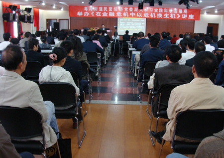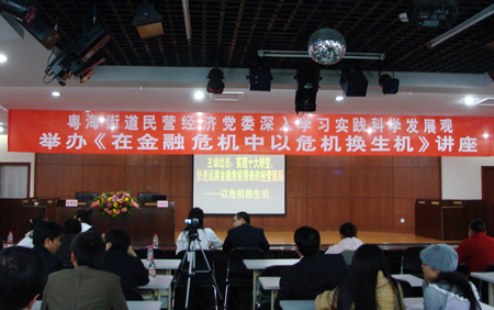 08年12月27日,劉祖軻在南山區(qū)進(jìn)行了主題為“主動出擊,實現(xiàn)十大轉(zhuǎn)變快速遠(yuǎn)離金融危機(jī)帶來的經(jīng)營困局——以危機(jī)換生機(jī)”的講座。