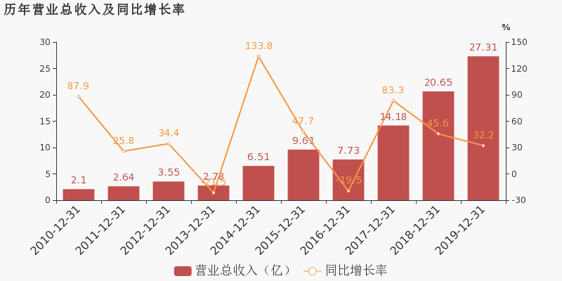 2020年4月28日,維爾利發(fā)布年報(bào),公司2019年實(shí)現(xiàn)營業(yè)總收入27.3億,同比增長32.2%,增幅連續(xù)3年保持在31%以上的高速增長;實(shí)現(xiàn)歸母凈利潤3.2億,同比增長36.3%,增幅連續(xù)3年保持在35%以上的高速增長;每股收益為0.4元。20年一季度公司實(shí)現(xiàn)營業(yè)總收入5.2億,同比增長10.2%;歸母凈利潤4750.5萬,同比下降34.8%。