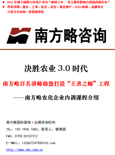 南方略先后助力服務(wù)魯西化工、中鹽紅四方、重慶建峰化工、中東化肥、拉多美、華強化工、諾普信、廣西田園、紅太陽、僑昌化學、江蘇龍燈、燕化永樂、青島瀚生、海利爾、金元萊、天津漢邦等農(nóng)化優(yōu)秀企業(yè)。我們將服務(wù)農(nóng)化企業(yè)的成功咨詢案例提煉為培訓課程,整合農(nóng)化行業(yè)百名講師,強勢推出“決勝農(nóng)業(yè)3.0時代,南方略百名講師助您打造“王者之師”工程,幫助農(nóng)化企業(yè)顛覆傳統(tǒng),擁抱時代,迎接挑戰(zhàn),再次搶占創(chuàng)富風口,飛起來!