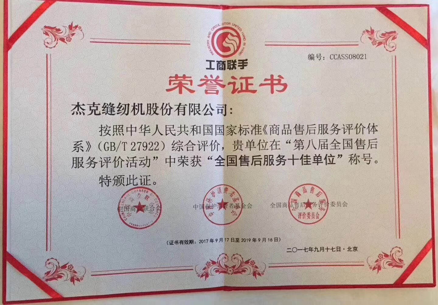 熱烈祝賀南方略客戶-杰克縫紉機第四次獲得全國售后服務(wù)十強單位!
